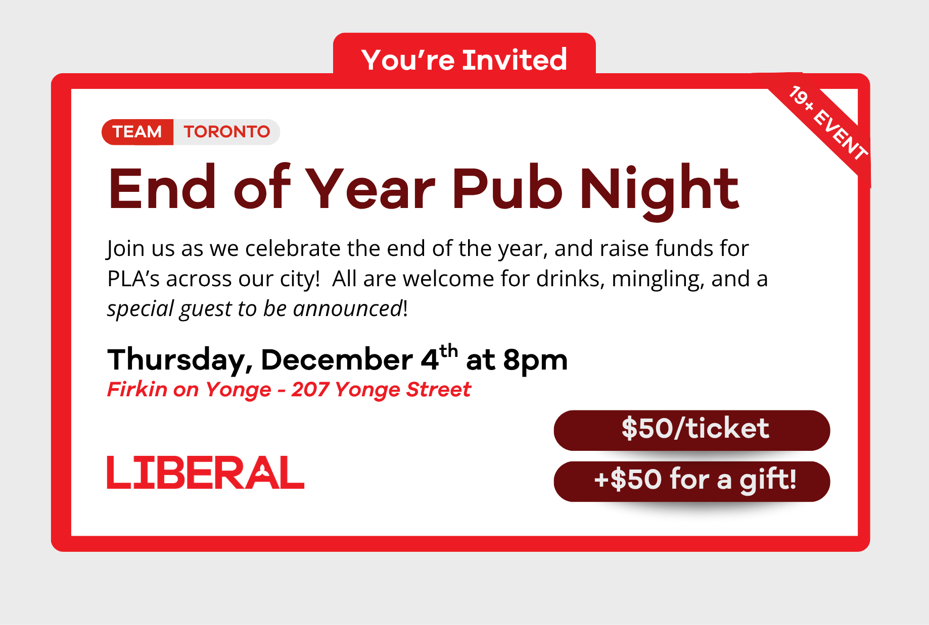 A ticket gets you in, as well as your first drink, and some light bites. For an additional $50 ($100 total) you’ll get an exclusive gift as a part of your entry! You will receive a tax receipt for your donation minus the costs of your participation. All funds raised will go toward central Toronto ridings so that we can flip some seats in the 416!