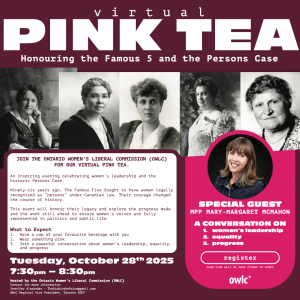 Join the Ontario Women’s Liberal Commission (OWLC) for our first-ever Virtual Pink Tea, an inspiring evening celebrating women’s leadership and the legacy of the Persons Case — the 1929 Supreme Court decision that recognized women as “persons” under Canadian law.