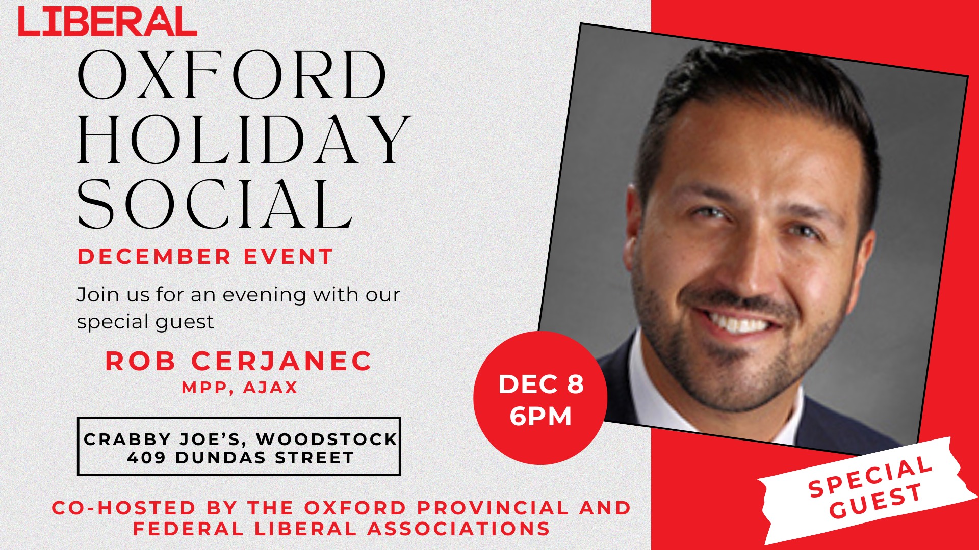On Monday, December 8, 6:00PM, join fellow Oxford Liberals and special guest Rob Cerjanec, MPP for Ajax at Crabby Joe’s for the Oxford Liberal Holiday Social, where we’ll come together to celebrate the season, connect with fellow members, and enjoy an evening of good conversation and community spirit.